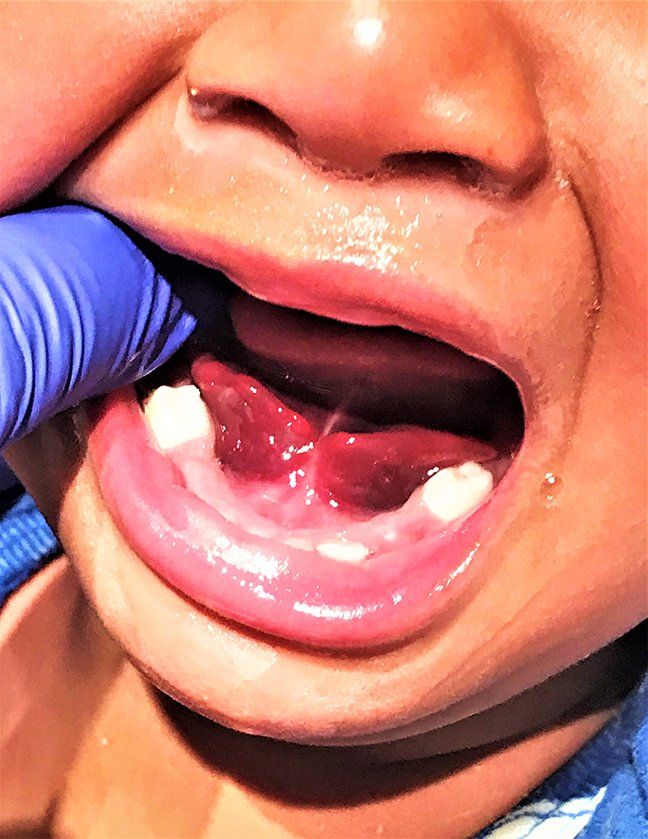 Physical abuse in infants and children is a rare cause of sublingual hematoma. Most common injuries are tears of the lingual frenulum and open wounds of the floor of the mouth, gingiva, and palate.10 Metaphyseal bone fractures, rib fractures, various skin bruises, and retinal hemorrhages are other clinical findings of child abuse. Bleeding diathesis, osteogenesis imperfect, cutis laxa, and Ehlers-Danlos syndrome should be ruled out before the diagnosis of child abuse.