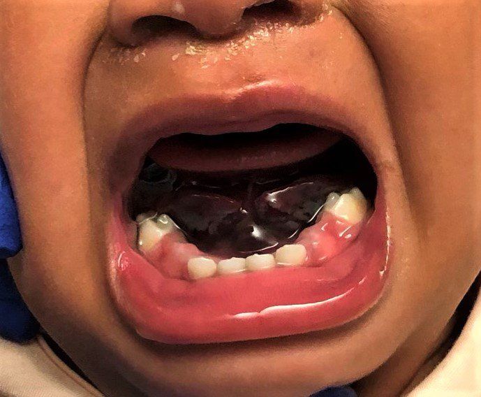 On repeat exam after a few hours, clinicians noticed that the color of the swelling changed to dark purplish color (Figure 3). Based on the acuity of presentation, color change of the hematoma, mild bleeding from the swelling, and midline acute tender fluctuant swelling, they strongly suspected oral trauma in this case. As the mother denied any significant trauma, they communicated with the daycare center staff for further clarification and inquired about any possible oral trauma/fall/significant injury during the child’s daycare stay. The staff confirmed that the girl had fallen with a toy (Figure 4) in her mouth/neck while she was running in the daycare.