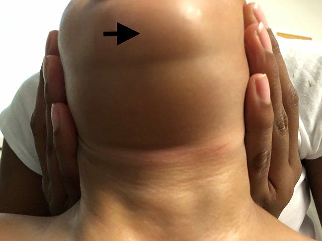 Sublingual caruncles looked swollen and elevated. There was no evidence of any wheezing, stridor, or difficulty with respiration. On examination of the neck, clinicians noted a small swelling in the midline that was soft, fluctuant, and tender to touch, located just behind the chin (Figure 2).