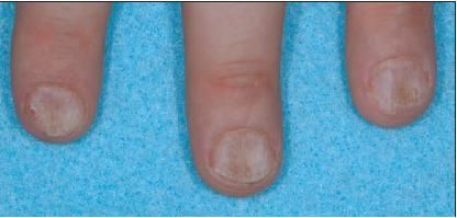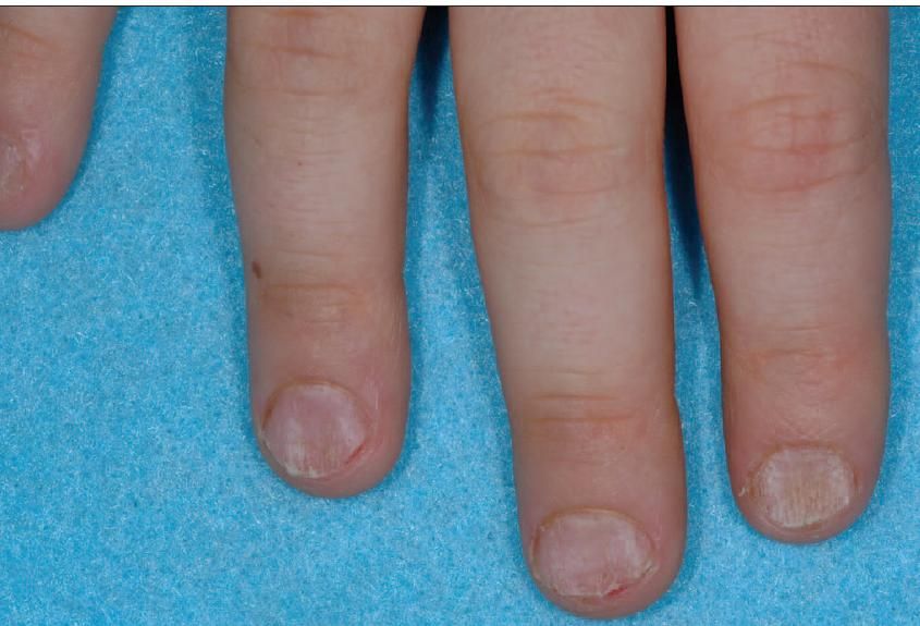 The mother of this school-aged girl is concerned that her child has a fungal infection in her fingernails and that the nails are destroyed forever. Your examination reveals that all 20 of her nail plates are affected similarly.