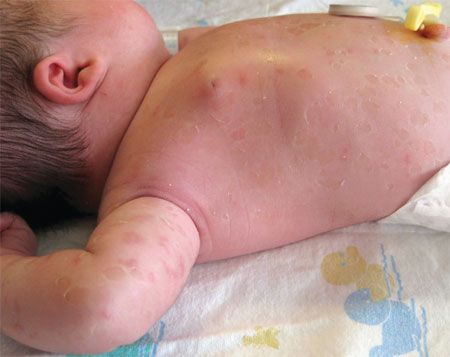 This benign but impressive neonatal eruption progresses through several stages, beginning with pustules that quickly rupture and leave flat macules with collarettes of scale. The pustules may rupture in utero, and the neonate may present at birth with the macules, as was the case in this baby boy.