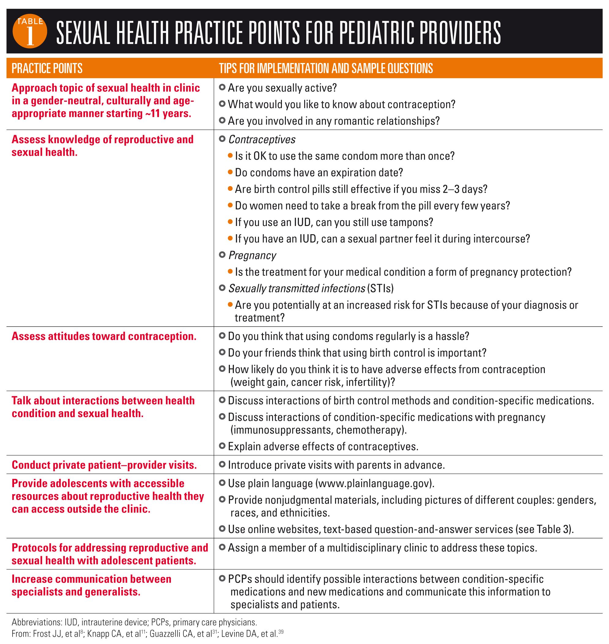 Most adolescents do not feel comfortable raising questions about sex with their providers without being prompted to so. In one study, only 3% of adolescents independently introduced topics of sexual behavior, STDs, or birth control with their physicians.16 Within pediatric subspecialty clinics, concerns adolescents may have about their bodies or sexuality may be overshadowed by their chronic health conditions.14 Yet, to meet the basic transition goal of discussing future adult healthcare needs with patients, reproductive and sexual health must be a necessary component of transition both within primary care and subspecialty pediatrics.2