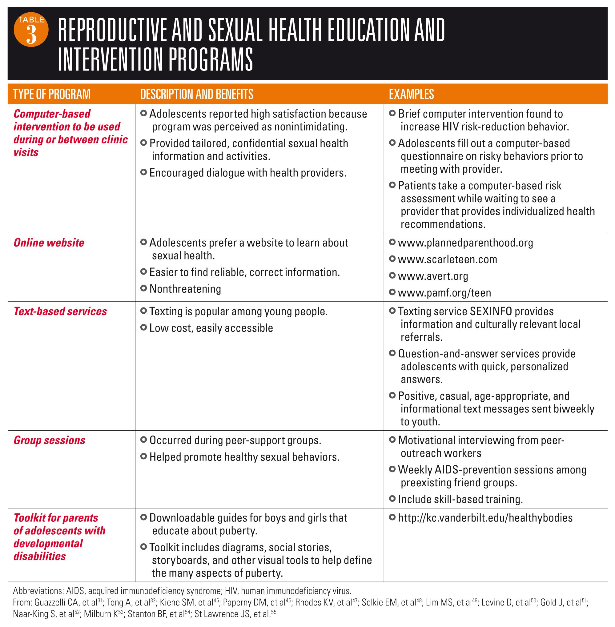 Adolescents with chronic illnesses want more information about reproductive health services.19 However, they have limited access to reliable information outside the clinical setting. For example, abstinence-only, school-based programs have been shown to be associated with higher rates of teenaged pregnancy and sexually transmitted infections (STIs), suggesting that adolescents are not receiving adequate education regarding sexual and reproductive health and decision making.20 In addition, school-based sexual health programs likely do not address issues related to reproductive health and sexuality in the context of a chronic medical condition.20,21