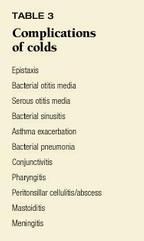 Although the symptoms of most URIs are mild or moderate and resolve in a week or two, complications may occur (Table 3). Eustachian tube dysfunction is common. Studies in adults show that over 70% of individuals infected with rhinovirus develop eustachian tube dysfunction soon after viral inocululation.1 Acute bacterial otitis media may complicate URIs in children.1 Viruses commonly isolated from middle ear fluid of children who sought medical attention for acute otitis media and had tympanocentesis performed to determine the cause included RSV, parainfluenza viruses, and influenza viruses.7