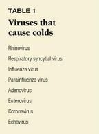 Rhinovirus, with at least 100 serotypes, is responsible for one third to one half of all colds. Other common pathogens in children under 4 years of age include respiratory syncytial virus (RSV), influenza virus, parainfluenza virus, and adenovirus (Table 1).1 In older children, coronaviruses, echovirus, and enteroviruses also may cause colds.