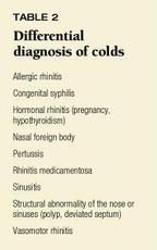 The signs and symptoms of the common cold are nonspecific and easily confused with a number of other conditions (Table 2). Allergic rhinitis can cause significant rhinorrhea, but this may be seasonal, watery (never becoming thicker or whitish), unaccompanied by fever, and associated with other signs of allergy such as nasal itching (and the "allergic salute"), allergic "shiners," eczema, and asthma. Microscopic examination of nasal mucus using Hansel's stain reveals numerous eosinophils, confirming a clinical suspicion of allergic rhinitis and suggesting a therapeutic trial of an oral antihistamine, nasal cromolyn, or steroid.