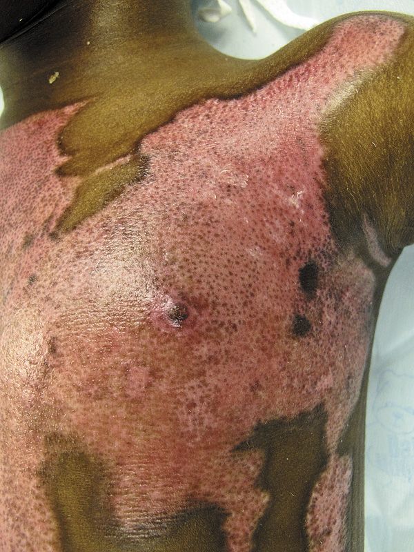 FIGURE Lateral left chest of a child with scald injury on day 10 after the burn. Scalloped epithelial edges are characteristic of viral infection.require the monitoring and expertise of a burn center. Some atypical forms of burn wound infections, however, may present in small and superficial burns; for example, herpes simplex virus.12 In these cases, inspection will show an atypical pattern, with the burn wound healing edges scalloped with visible vesicles. A careful history should reveal previous herpes simplex infection in the child. Appropriate antiviral therapy should allow normal healing (Figure).