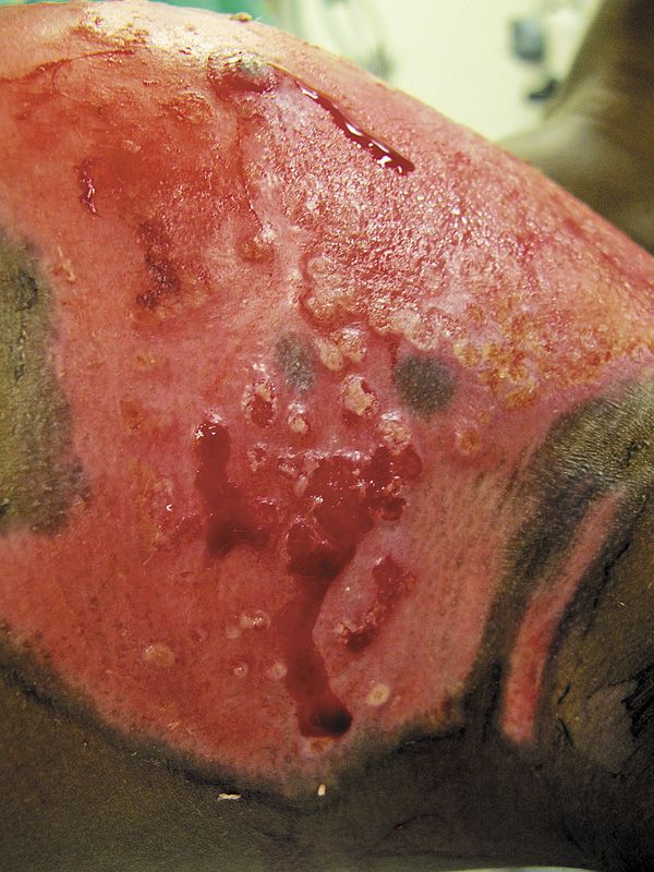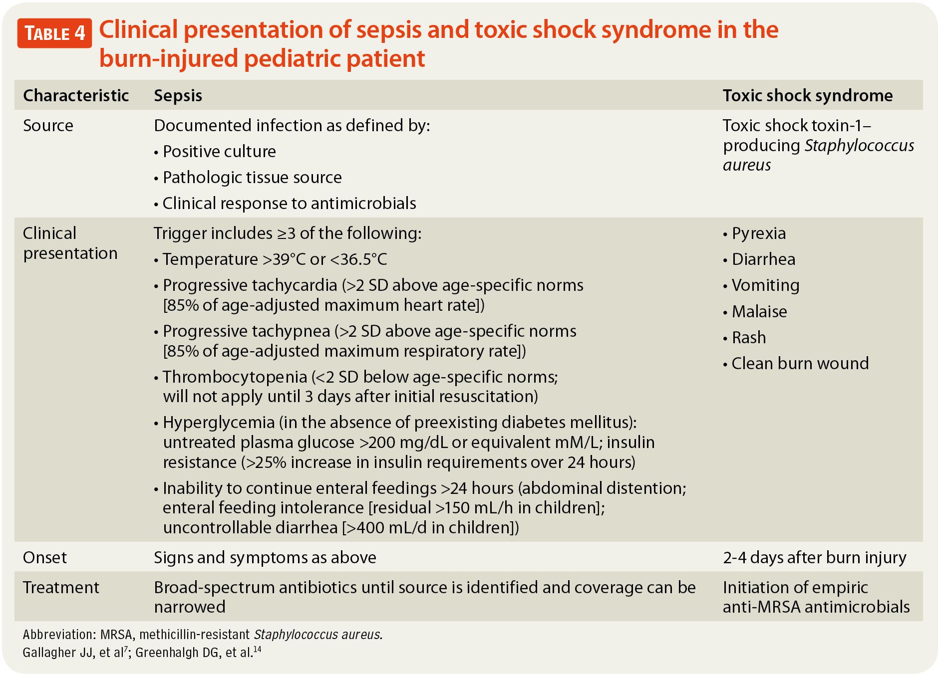 Toxic shock syndrome (TSS) from toxic shock toxin-1–producing S aureus is a rare but serious complication of burn infection that primarily affects young children because of their lower levels of protective antibodies.13 Clinical TSS presents with a variety of symptoms, including rash, irritability or lethargy, pyrexia, and shock.7,13 A common scenario of TSS involves a young child with a small burn who experiences rapid deterioration; the condition can become life threatening within hours unless it is recognized and treated promptly.13 Mortality is a significant risk.7 Children with bacterial sepsis deteriorate over 12 to 24 hours, and in most cases respond