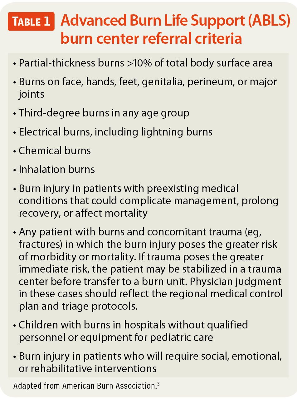 3. American Burn Association. Burn center referral criteria. http://www.ameriburn.org/BurnCenterReferralCriteria.pdf. Accessed July 30, 2013.