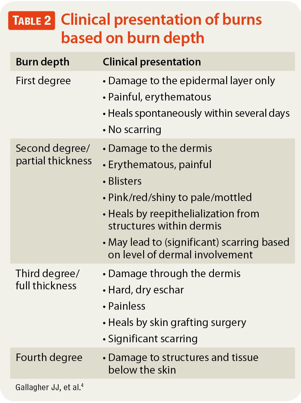 layers from the epidermis through the deep dermis and underlying tissue (Table 2).4 Commonly, burns are of mixed depth, and clinical judgment remains the best tool for determining wound depth and the need for skin grafting.2 To ensure the most accurate assessment of wound size and depth, the burned areas should be thoroughly cleaned and patted dry before visualization. Once dry, the wounds should be inspected for the extent of injury, the development of moisture, and the presence of pain. It is commonly agreed among burn surgeons that the more exudate is present, the higher the likelihood that the wound is superficial and will heal spontaneously. The drier the wound, the more likely it is to be deep and require further intervention. Pain associated with the wound can also provide insight into the depth; significant pain is characteristic of superficial to mid-dermal wounds, whereas minimal pain or absence of pain can indicate nerve damage consistent with deep partial or full-thickness injury.4