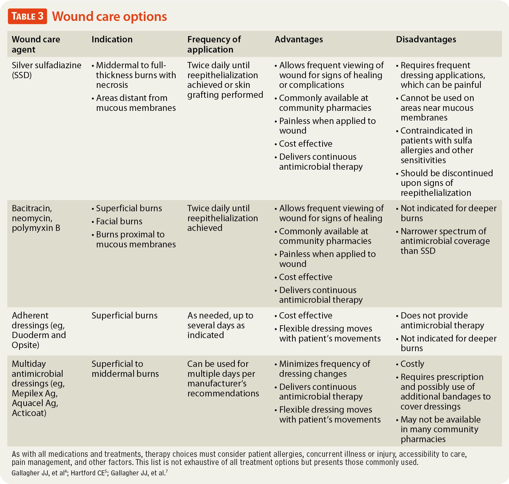 Silver sulfadiazine (SSD) offers broad-spectrum coverage and is most often used for middermal to full-thickness wounds with necrosis and in areas distant from mucous membranes (Table 3).4-7 Topical antibiotic ointments such as bacitracin are recommended