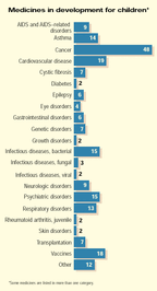 According to a new survey from the Pharmaceutical Research and Manufacturers of America, 217 new medications and vaccines for children are currently under development, 25 have been approved by the Food and Drug Administration (FDA) in the past year, and clinical trials will begin soon on another 52 candidates. FDA approvals went to a conjugate pneumococcal vaccine, a once-a-day therapy for AIDS, a remedy for juvenile rheumatoid arthritis, two new asthma meds, and one for children with partial onset epileptic seizures. Drugs currently in clinical trials or awaiting FDA action include many that are already approved for adults (asthma remedies such as zafirlukast, ventolin, and fluticasone, for example) but are now in trials specifically for pediatric use. The graph (below) summarizes the complete list of pediatric drugs under development.
