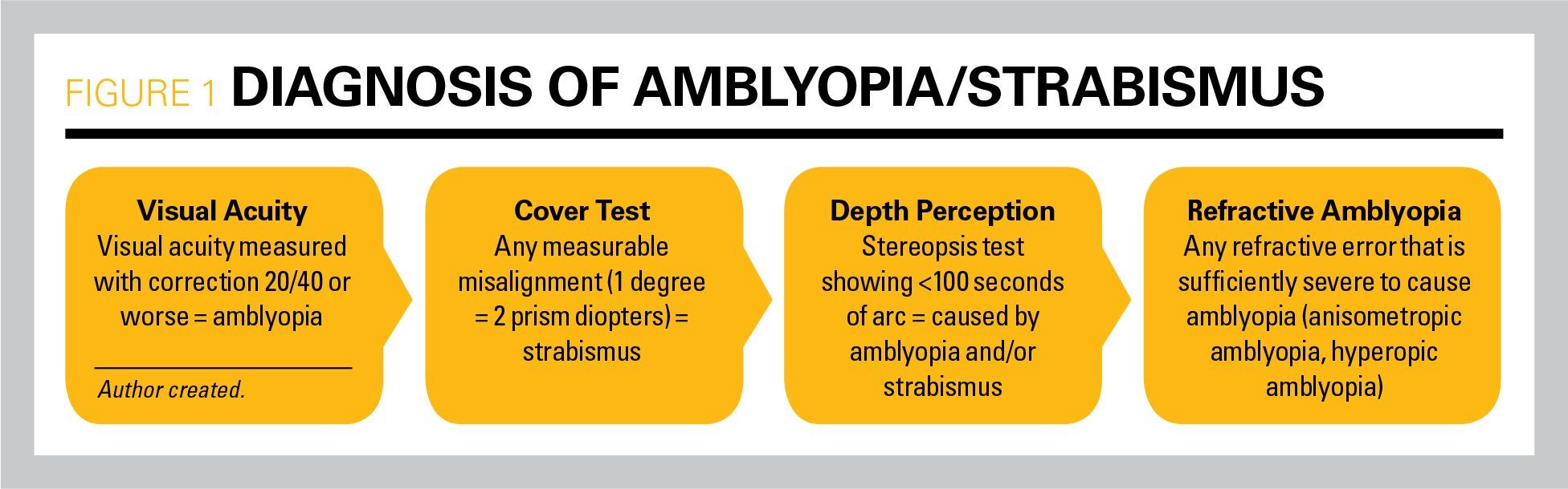 To confirm a diagnosis of amblyopia, an ophthalmologic exam is needed to perform the following: measure visual acuity; perform a cover test for strabismus; test depth perception (stereopsis); dilate the pupils (cycloplegia); perform a refraction; and examine the inside of the eye to confirm there is no structural eye disease (Figure 1). Although ophthalmologists and pediatricians both measure visual acuity, testing is more accurate when performed by ophthalmologists given the nature of their training and child-specific testing methods available to them.