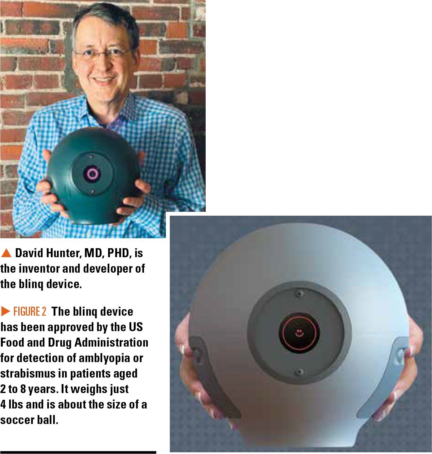 David Hunter, MD, PhD, is the Ophthalmologist-in-Chief at Boston Children’s Hospital, Massachusetts. He has spent more than 15 years developing a new technology for detecting amblyopia and strabismus in young children. This technology is called retinal polarization scanning (RPS), and the prototype device using the technology was originally called the Pediatric Vision Scanner. He formed Rebion (formerly REBIScan) in 2009 to commercialize the device, and the final version, recently released, has been appropriately named “blinq.” (Figure 2). Hunter named the propriety technology behind the blinq “neural performance scanning (NPS)” to remind users that the screening device was developed to help detect amblyopia “which is a brain disease, not an eye disease.”