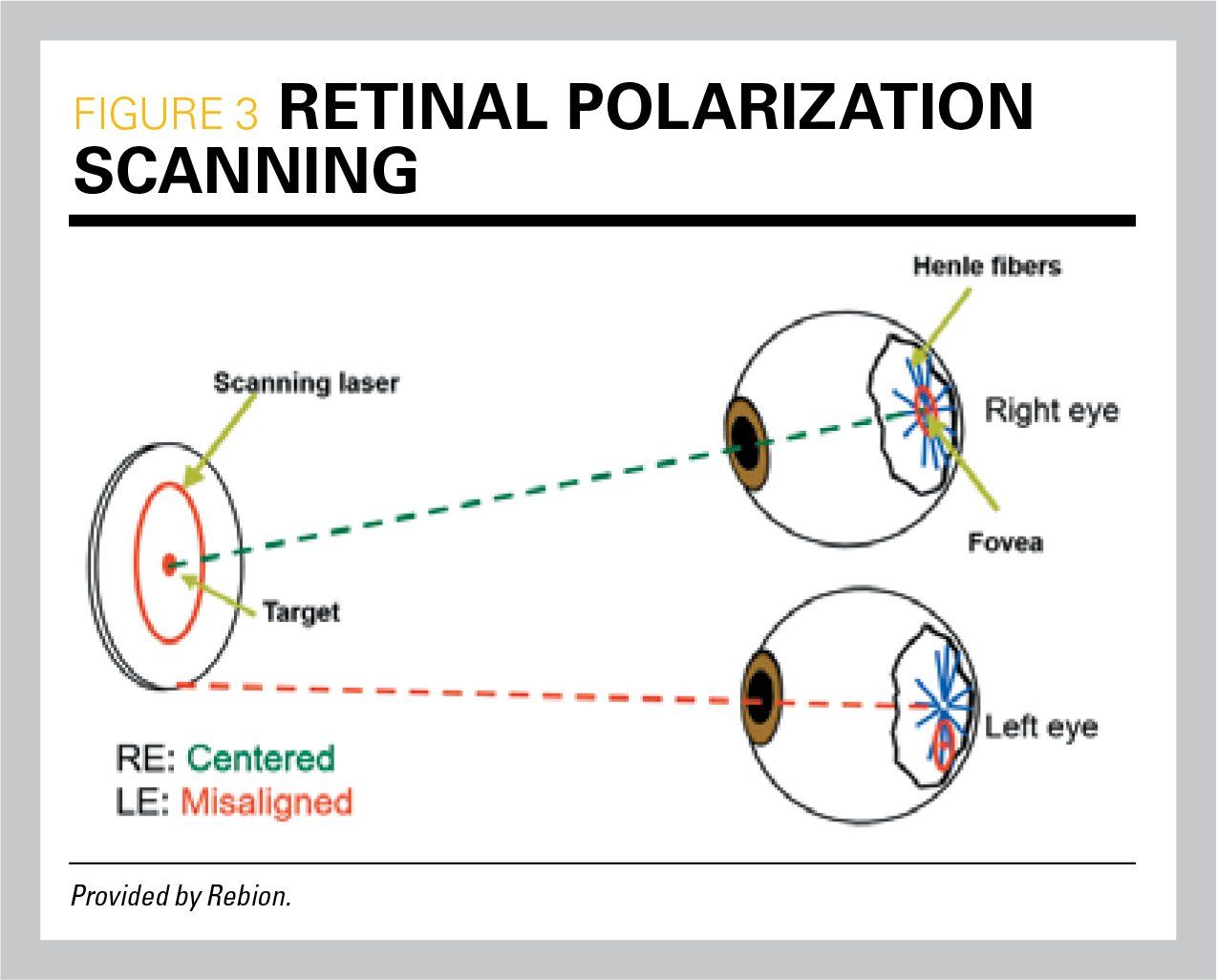The technology is based on the fact that when one eye has diminished vision, the brain cannot align both eyes to achieve stable binocular fixation. When polarized light is projected on the nerve fibers surrounding the fovea (the area of the retina responsible for central vision), these fibers change the polarization of light projected onto this area. The blinq device projects a beam of polarized light onto the retina while the child focuses on a light target 14 inches away, and the changes from the light reflected by the fovea of each eye are analyzed by the device (Figure 3). Five scans are completed in a 2.5-second interval and the device calculates a binocularity score. A score above 60 indicates perfect eye alignment. A score below this measurement indicates amblyopia, strabismus, or microstrabismus.