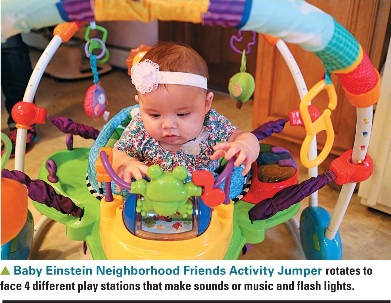 My granddaughter loves her Baby Einstein Neighborhood Friends Activity Jumper (Kids II, Atlanta, Georgia) that lets mom and dad watch her while they are relaxing or doing chores. She is positioned facing a play station with interesting toys that are colorful, make sounds or music, flash lights, and have inviting textures. She can be rotated in the jumper to face 4 different play areas, each with different toys. The jumper has loops that give you the ability to attach age-appropriate toys of your own choosing.