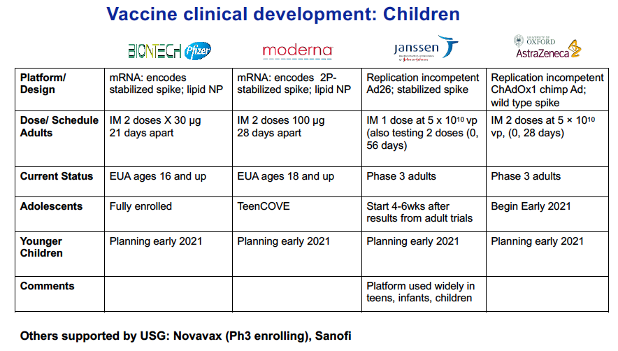 These companies are scaling up their manufacturing capacity as quickly as they can. The Pfizer product is already out there, it’s same dose down to age 12; and so, presumably children can get that, it is just a matter of supply. The hope is that once kids are in the queue, so to speak, they will then have an adequate supply. A lot of this will depend on these other vaccines. So, the Pfizer product is the one most likely to be available to children first. And, once they open up the high-risk categories, those teens that are high risk could be vaccinated as well. We also have to think about other phases, so if the Johnson and AstraZeneca products get an EUA from the FDA in the coming months, that will greatly increase our supply across the United States. Therefore, the Pfizer product may be able to be diverted to children. On the other hand, if we have really constrained supplies come May, June, then that will be an issue because we will still need to go through other phases, essential workers, high risk conditions, etc.