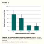 Control subjects exhibited a 1% to 3% annual decrease in percent predicted forced expiratory volume in one second (FEV1), whereas budesonide-treated subjects exhibited significant improvement over baseline and compared with controls. Furthermore, the duration of asthma before treatment was associated with treatment response: Children who received inhaled budesonide within two years of asthma onset had a significantly greater increase in FEV1 than children with a history of asthma longer than five years (Figure 3).19 This study supports the value of early intervention with an inhaled corticosteroid.