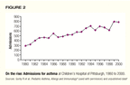 The hospitalization rate among children with asthma in the United States also has increased dramatically since the 1960s. According to recent data, the hospitalization rate for asthma remained relatively constant from 1980 to 1993 in the 5- to 24-year-old group but rose significantly in children younger than 1 yearfrom 35.6 to 64.7 per 10,000 hospitalized children younger than 1 year.2 Through 1992, the rate in the 1- to 4-year-old group rose from 38.3 to 60.1 per 10,000 hospitalized children 1 to 4 years old.2 Numerous smaller, hospital-based studies have demonstrated significant increases in hospitalization rates. The asthma hospitalization rate at Children's Hospital of Pittsburgh, for example, increased significantly between 1980 and 2000 (Figure 2).3,4