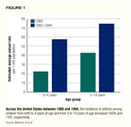 Asthma is the most common chronic childhood illness. The estimated number of children younger than 14 years who have asthma was approximately 4.1 million in 19931994, a 1998 study revealed.1 The incidence of pediatric asthma has increased strikingly over the past few decades. Between 1980 and 1994, there was a 160% increase in the incidence of asthma among children 4 years of age and younger (from 22.2 to 57.8 cases per 1,000), and a 74% increase among children 5 to 14 years old (from 42.8 to 74.4 cases per 1,000) (Figure 1).1 Similar increases have been reported worldwide.