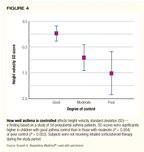Impaired growth has been demonstrated in children with chronic allergic disorders, including severe, poorly controlled asthma. In one study of 58 prepubertal asthmatic children before inhaled corticosteroid therapy was initiated, a significant association was demonstrated between height-velocity standard-deviation scores and degree of asthma control (Figure 4).26 Scores were significantly higher in children with good asthma control compared with those with moderate or poor controlsupporting a treatment-independent association between poorly controlled asthma and growth impairment.