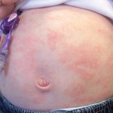 This 9–month–old boy was initially evaluated at age 6 weeks for an extensive eczematous rash on the head and antecubital and diaper areas and blood and mucus in the stool with each diaper change over a 2– to 3–week period. The symptoms were attributed to milk allergy, and the infant’s formula was changed. At 8 weeks of age, a petechial rash developed on the boy’s trunk and legs. His symptoms persisted despite multiple formula changes, and he was referred to the emergency department.