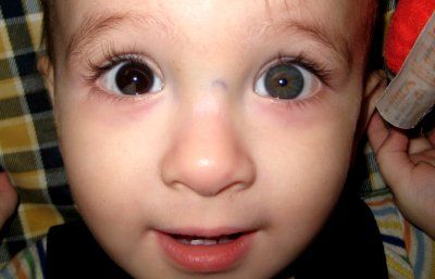 Heterochromia of the iris is relatively uncommon and may be congenital or acquired. This child has congenital heterochromia, which is usually inherited as an autosomal dominant trait but may be seen in mosaicism, or rarely in chimerism. In isolated cases, it has no medical significance, and otherwise healthy patients can be reassured of its benign prognosis.
